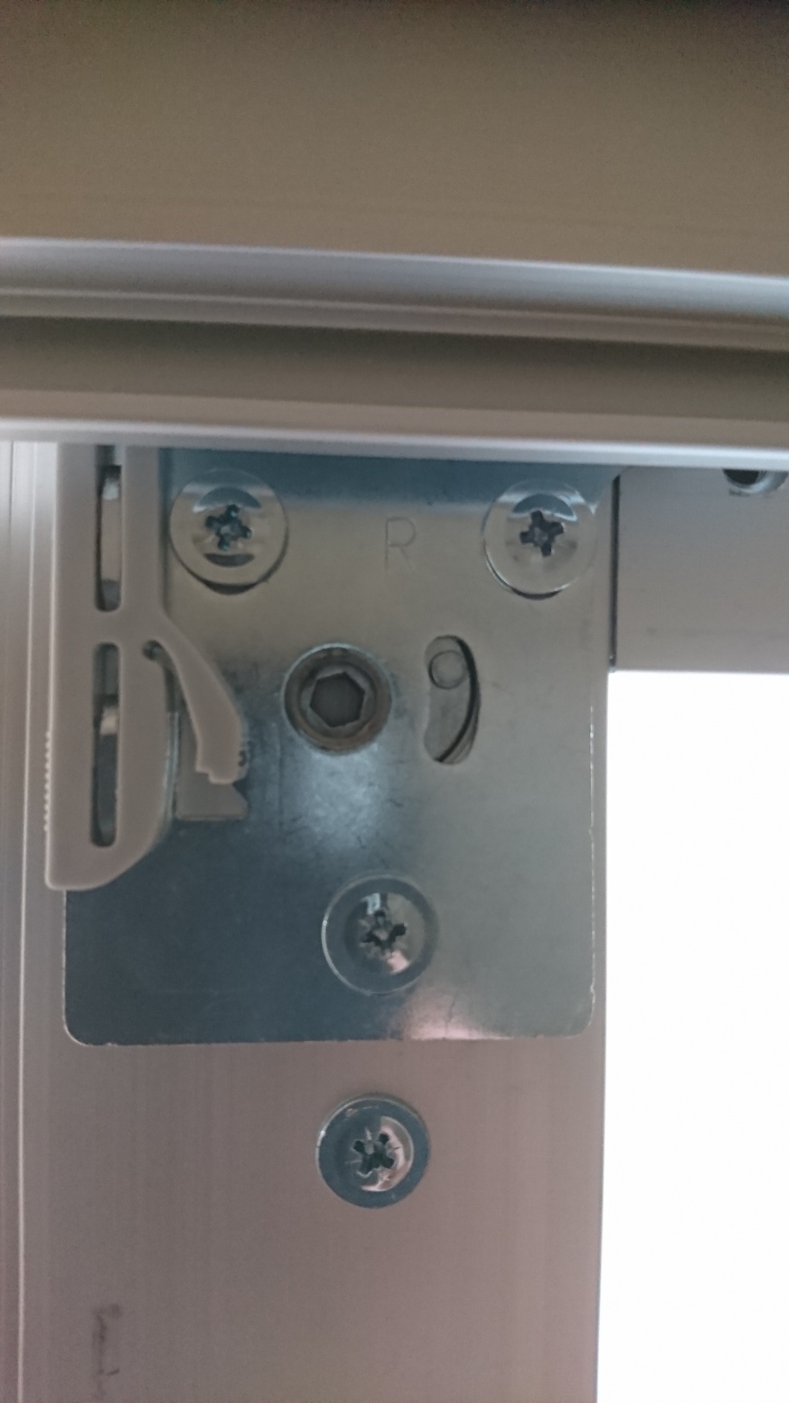 このカバーによって引戸が引き違い(左右自由に行き来する)にはならないようになっているので、外すことによって引戸フレームの上部左右にある調整金具をいじることができるようになります。